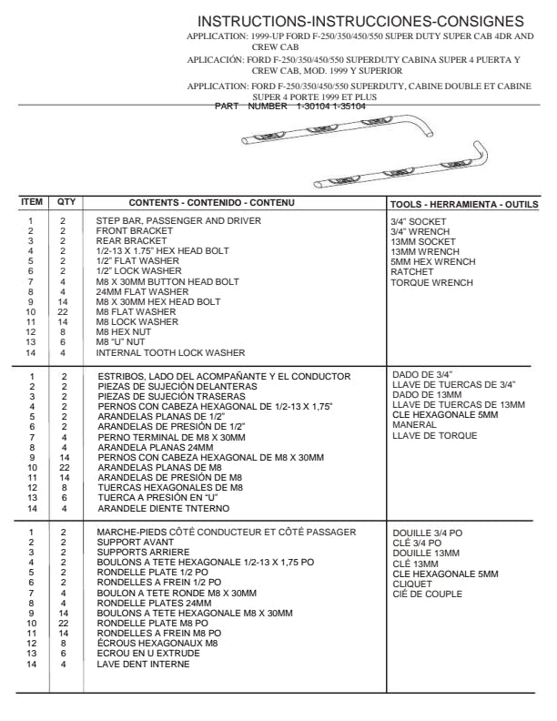 This product contains two (2) nerf bars, mounting kit, and all installation hardware. Note: Because every vehicle is different, your exact Step may have certain features like bends, mounting locations, and end caps that may be slightly different than the product descriptions.